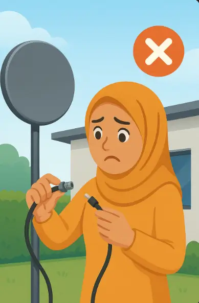 Seorang pelanggan di kawasan Cilincing, Jakarta Utara, melaporkan kehilangan siaran digital setelah menyambung kabel antena sendiri menggunakan konektor bekas. Setelah dilakukan pemeriksaan oleh teknisi profesional, ditemukan bahwa inti kabel tertekuk dan pelindung luar tidak menempel sempurna pada konektor F.